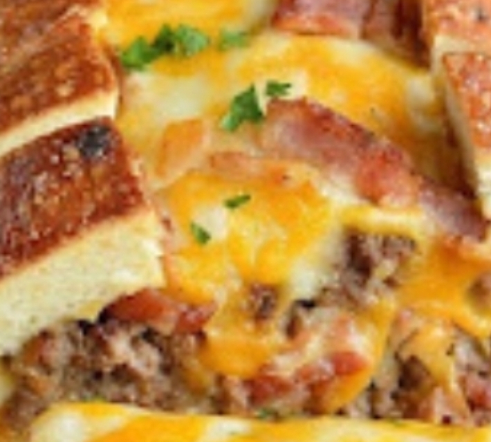 Breakfast garbage bread: Fill with scrambled eggs, sausage, and cheddar.