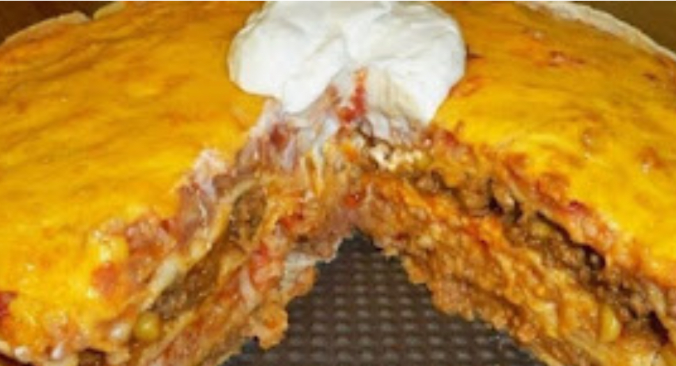 4 layer tortilla . beans ,meat, corn, rice, salsa and cheese