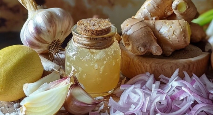 This simple natural mix combines five powerful ingredients that have been used for generations in traditional home remedies. When used together, ginger, onion, garlic, lemon juice, and honey create a blend that supports overall wellness, especially during seasonal changes.