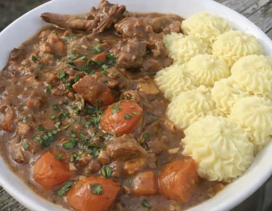 Enjoy your hearty and flavorful rabbit stew with mashed potatoes!
