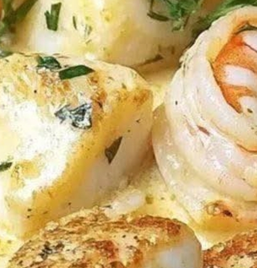 The finished dish features flaky, tender cod and juicy shrimp bathed in a creamy, garlicky sauce with a hint of citrus and herbs. The sauce is rich yet balanced — buttery, fragrant, and irresistibly smooth. Every bite brings a harmony of textures and flavors: mild sweetness from the seafood, savory depth from garlic and cream, and freshness from parsley and lemon.