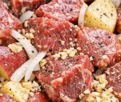 Arrange the cubed chuck roast evenly on top of the potatoes and onions. Positioning the meat above the vegetables allows it to braise gently in the liquid while its juices drip down, enriching the entire stew. - Mix the Liquids