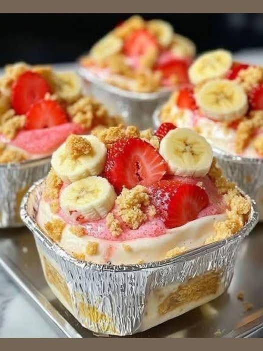 This creamy, fruity, dreamy dessert is a guaranteed hit—bringing together the best of banana pudding, strawberries, and cheesecake in every spoonful. Enjoy! 🍓🍌🥄